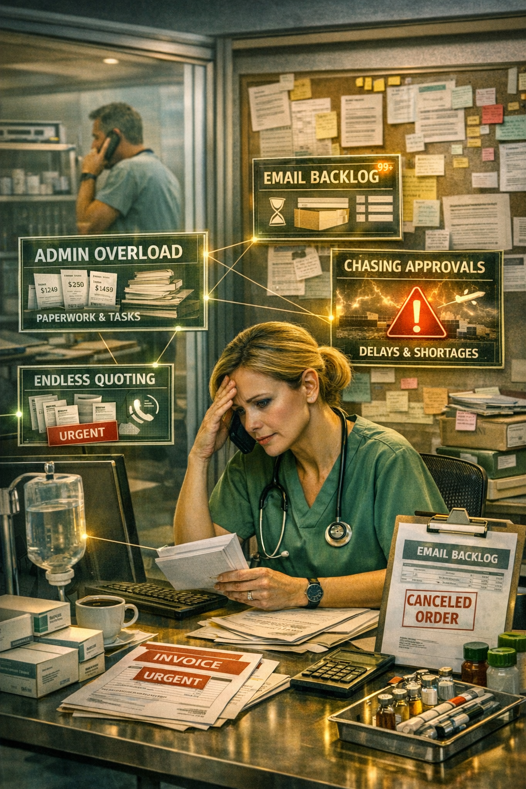 Staff time is often consumed by sourcing products, comparing prices, managing orders, and resolving supply issues—time that could be spent on patient care.
